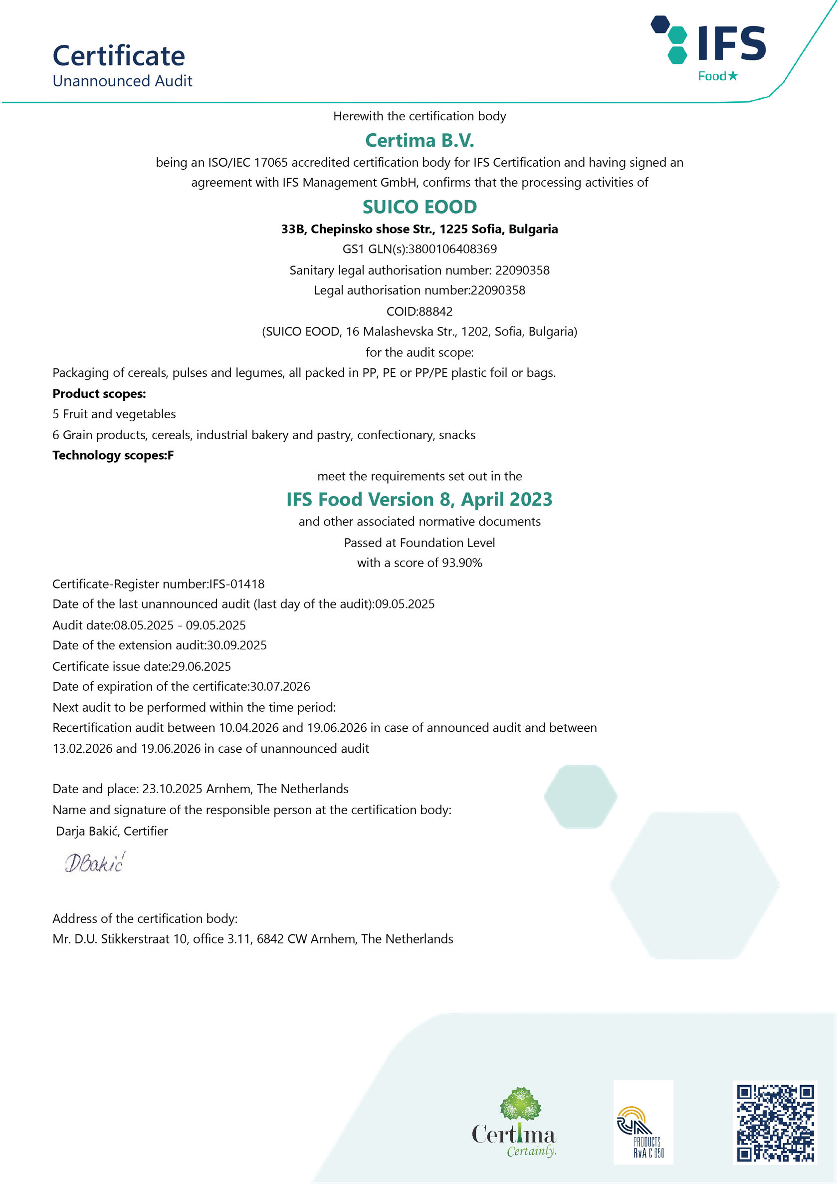 Ежегодно преминаваме успешно през проверките на сертифициращите органи за преработка на храни в България. Така гарантираме, че всеки пакет продукция отговаря на най-строгите стандарти за безопасност на храните според International Food Standard.